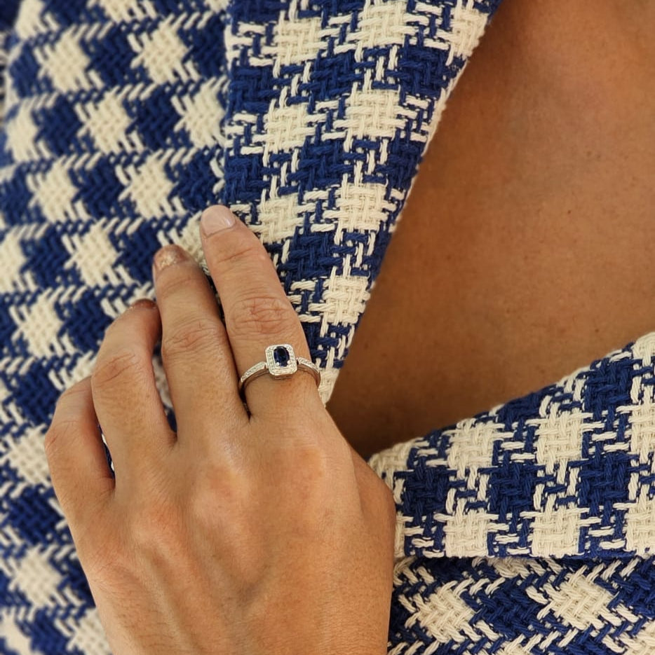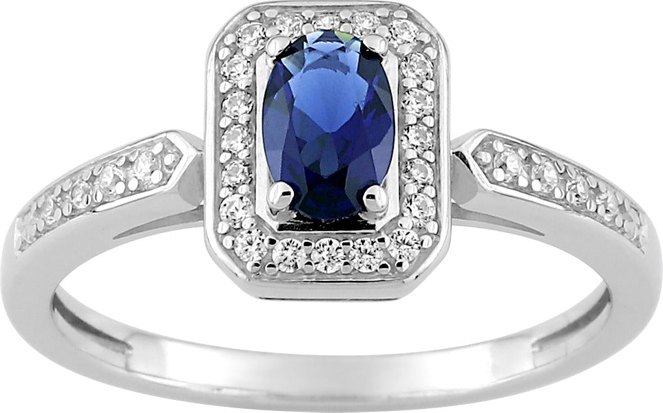 Anillo Plata de Ley rodeado, modelo con piedra oval color zafiro sintetica y circonitas a los costados. Disponible Talla 17/57  .
