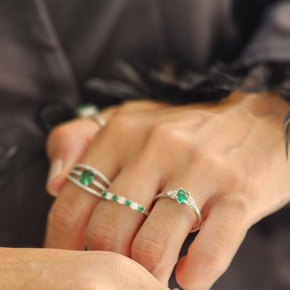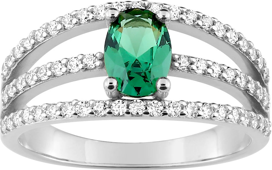 Anillo Plata de Ley, modelo rodeado por tres medios aros de circonitas blancas, estilo solitario con circonita oval color esmeralda sintetica en la parte delantera. Disponible Talla 20/60.