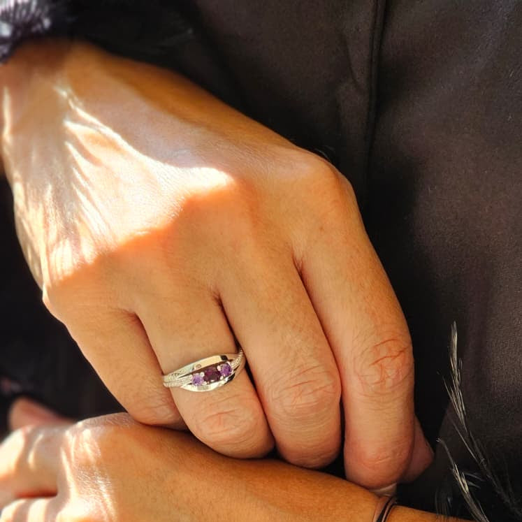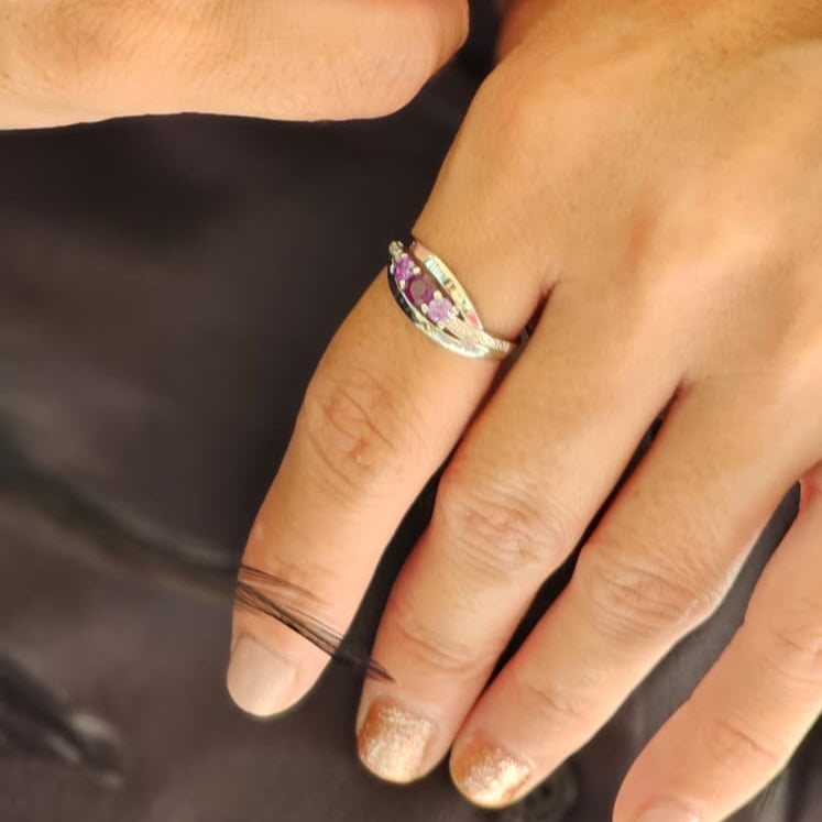 Anillo Plata de Ley, 3 circonitas color amatista sintetica en la parte central, que se establecen en 2 garras. Disponible Talla 16/56. es un diseño que está rodeado de un brillo precioso y con un resplandor central que ilumina todos tus look .
