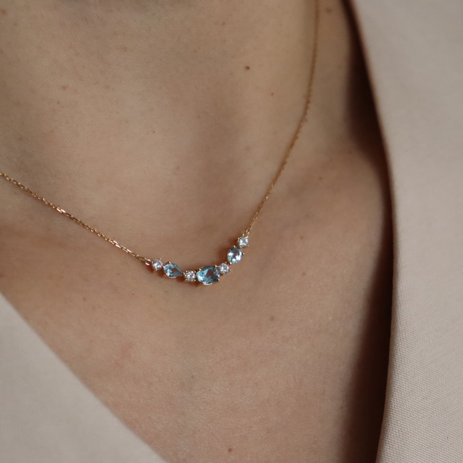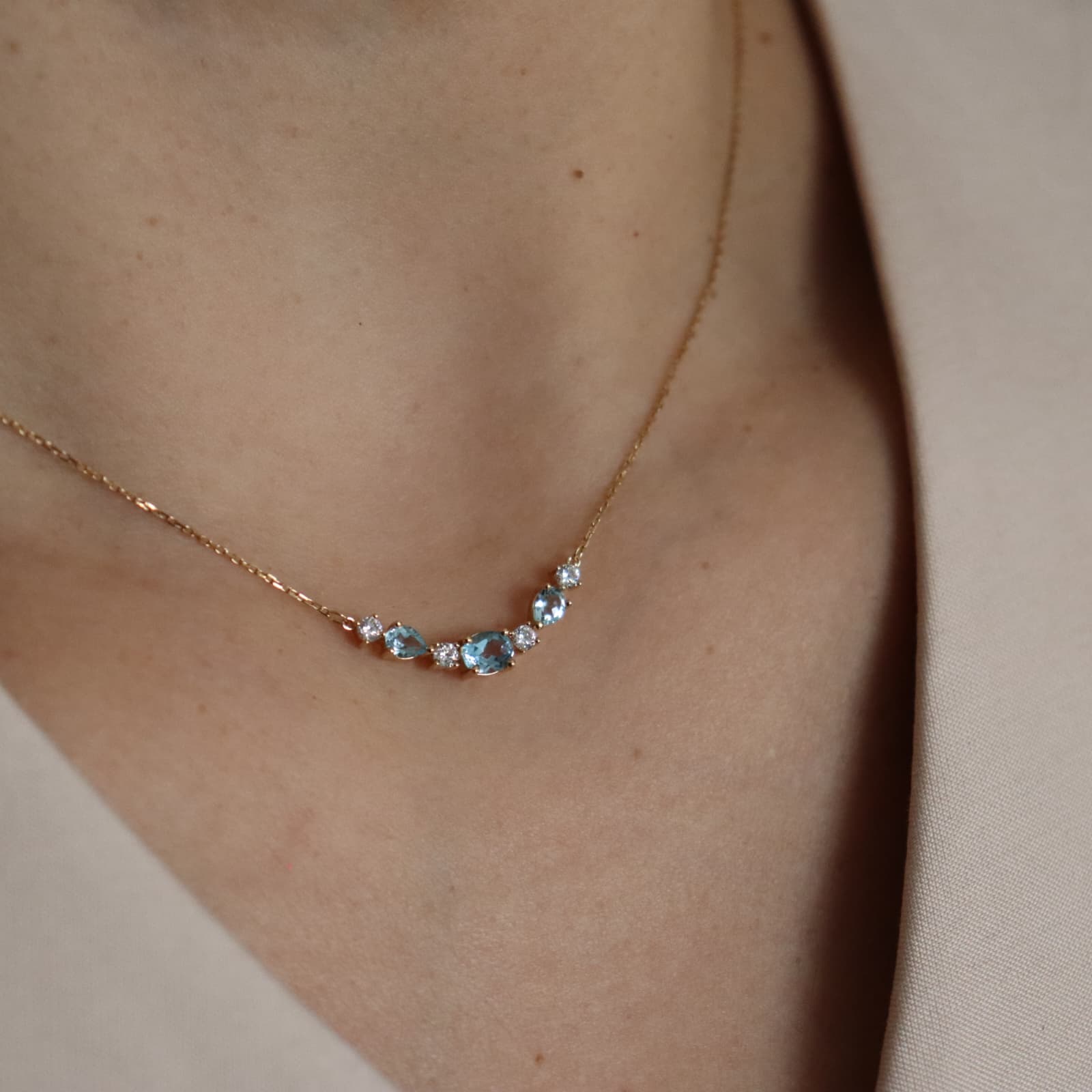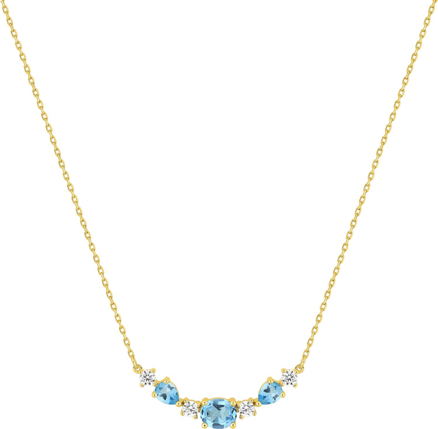 Enamórese de este sublime Collar de Oro Amarillo de 9K . Con colgantes de topacios azules tratados engastados cerrado conbinados con circonitas blancas. Largo de la cadena 42 cm