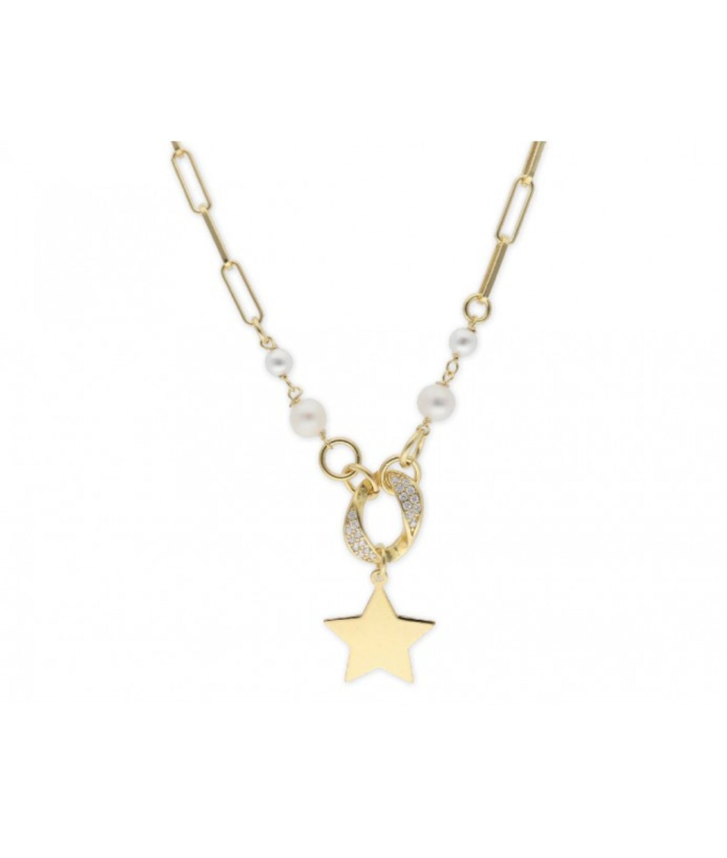 Collar Plata de Ley bañado en Oro colgante estrella combinado con perlas y circonitas. Largo 41+3cm extensión.