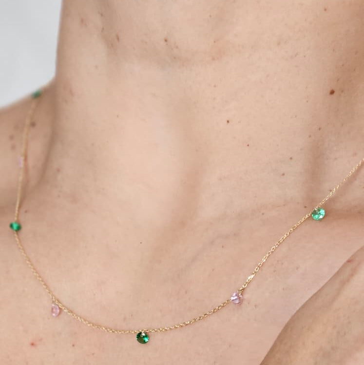 Enamórese de este sublime Collar de Oro Amarillo de 9K . Con pequeñas gotas combinados con circonitas rosas y verdes. Largo de la cadena 45 cm