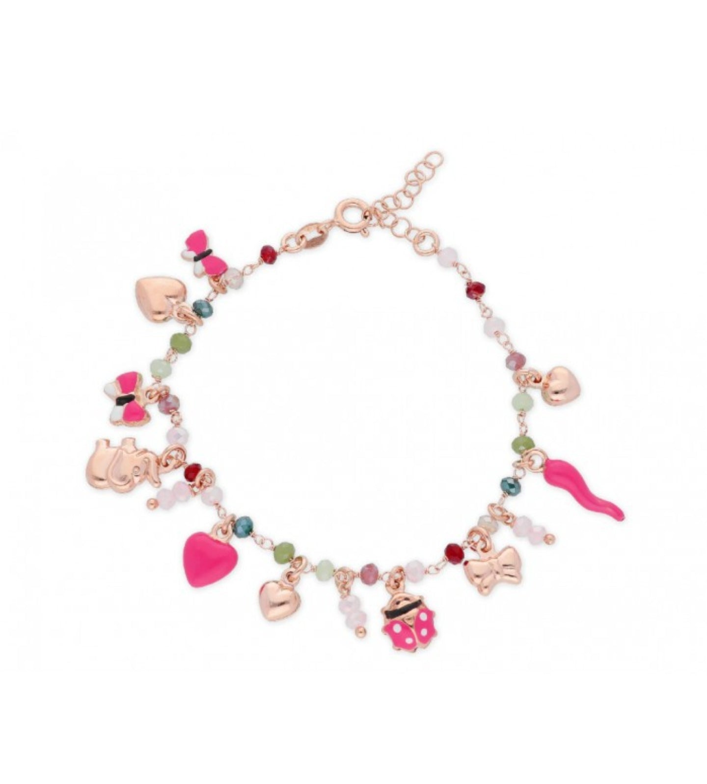 Collar Plata de Ley bañado en Oro Rose con diferentes colgantes en esmalte y plata. Largo 45cm.