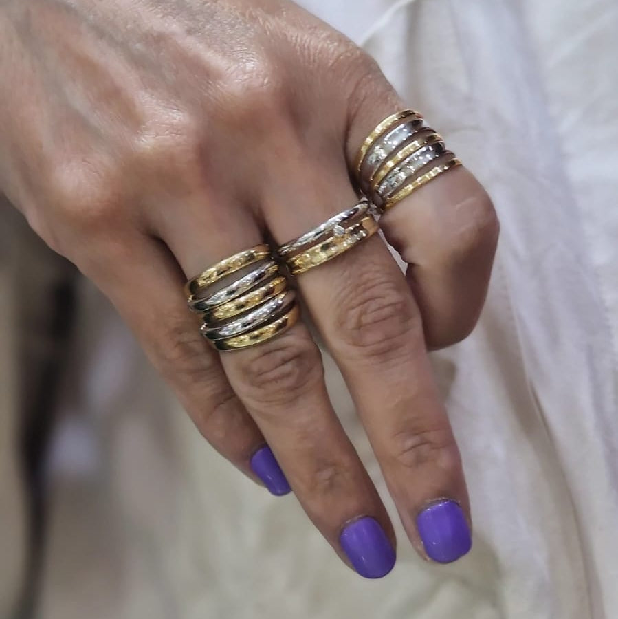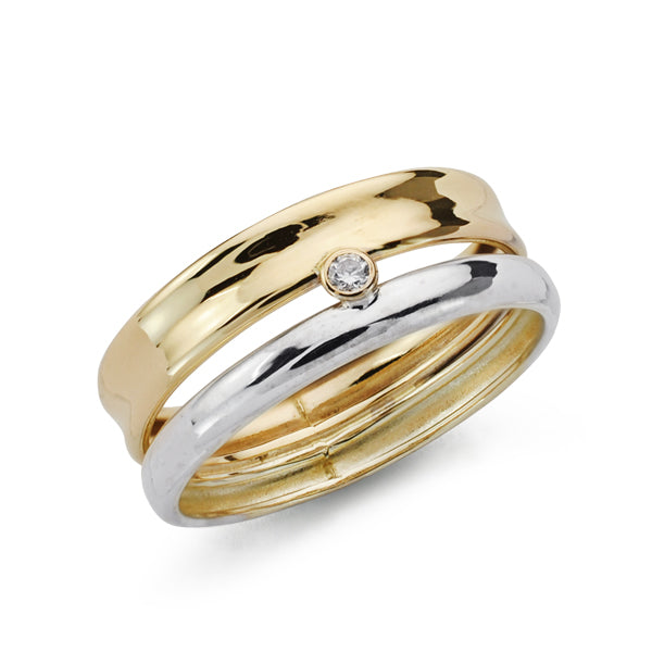 Sortija de oro 9K bicolor, diseñada especialmente para la mujer moderna. Esta joya destaca por sus bandas lisas que ofrecen un acabado sofisticado y atemporal. Disponible talla 13