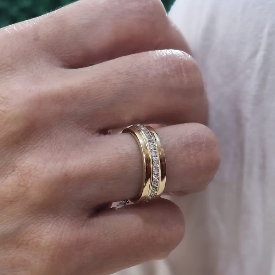 Sortija de Oro Amarillo 9K diseñado con circonitas que brillan intensamente. Con un diseño de carril en el centro y un ancho de cuerpo de 6.5 mm, esta pieza es perfecta para simbolizar amor y compromiso. Su acabado en oro resalta la belleza atemporal, convirtiéndola en una elección ideal para momentos especiales. Disponible en Talla 13