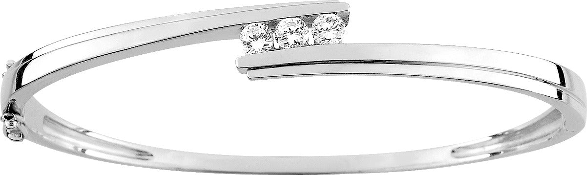 Pulsera de plata rígida con 3 circonitas es delicada y femenina. tiene 3 preciosos y discretos brillos en su centro. Su apertura es de los lados. S925-041
