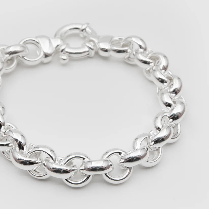 Preciosa Pulsera fabricada en Plata de Ley diseño rolo. Es una pieza estrella, sienta bien a cualquier edad y es capaz de animar cualquier outfit. La pulsera cuenta con eslabones circulares en cadena, cada uno midiendo 11 mm de ancho, creando un patrón distintivo y atractivo. Con un largo total de 20 cm, podrás adaptar perfectamente a tu medida ya que el cierre puede ser enganchado en cualquier arito, especial para complementar con charms de distintos tipos y chapitas grabadas o para llevar sencillamente sola.