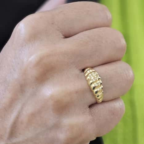 Sortija de Oro Amarillo 18K diseño croissant gallones brilloso de 7.5mm ancho, es una pieza de joyería que combina sofisticación y durabilidad, diseñada para resaltar la belleza y el estilo de quien la lleve. Confeccionada en oro de alta calidad, esta sortija ofrece un brillo resplandeciente y una elegancia atemporal que la convierte en una elección ideal para cualquier ocasión especial. Disponible talla 16